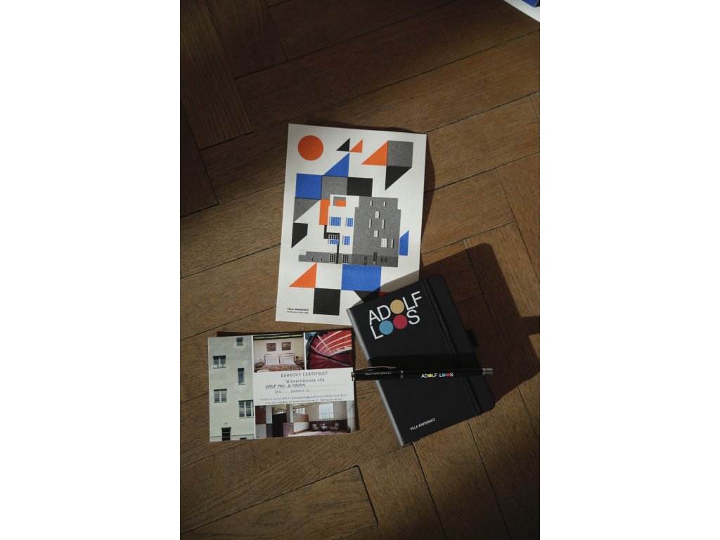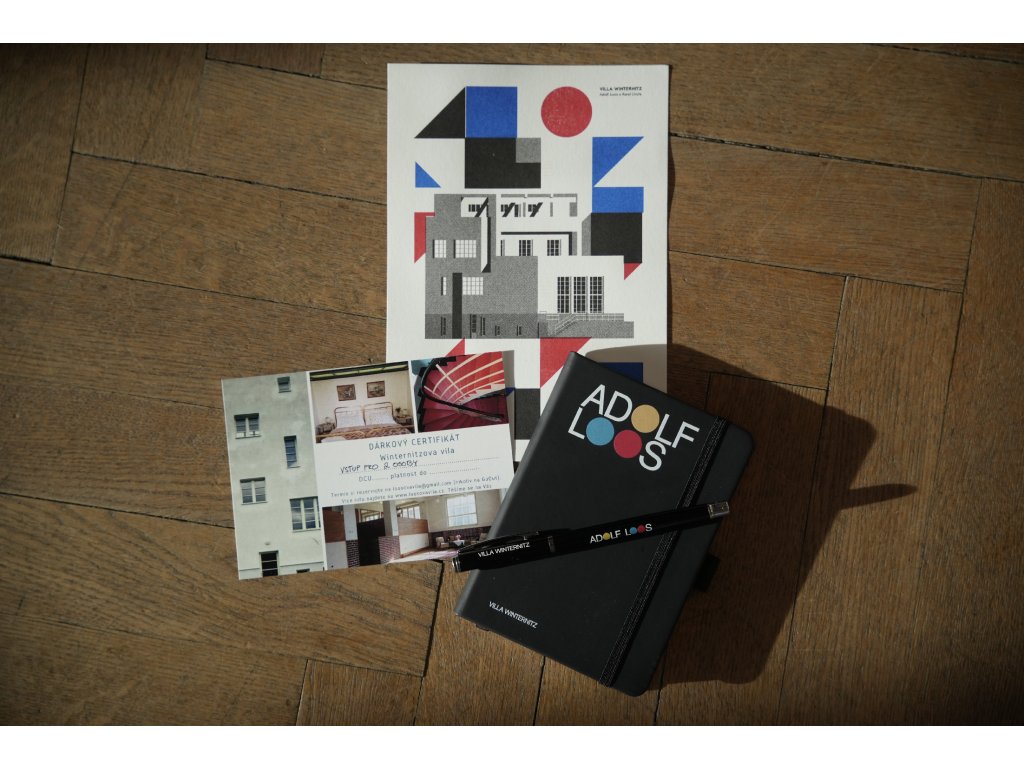 MALÝ DÁRKOVÝ BALÍČEK Z WINTERNITZOVY VILY neboli KPZtka obdivovatelů Adolfa Loose. Součástí je certifikát na 2 vstupy do Winternitzovy vily + zápisník A6 + kuličkové pero + grafika velikosti A5 od Jana Šráma.